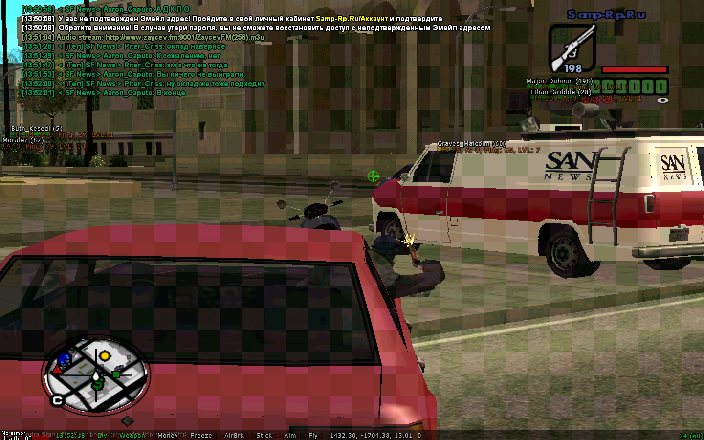 Подходим к незакрытому автомобилю, включаем нопы которые находятся выше. Затем идем во вкладку weapons, читерим один из видом оружий. Садимся в авто на пасс. место, достаем ган, выключаем ноп Disable Onfoot data. Включаем каршот ctrl + h. Читерим. При убийстве не кикает.