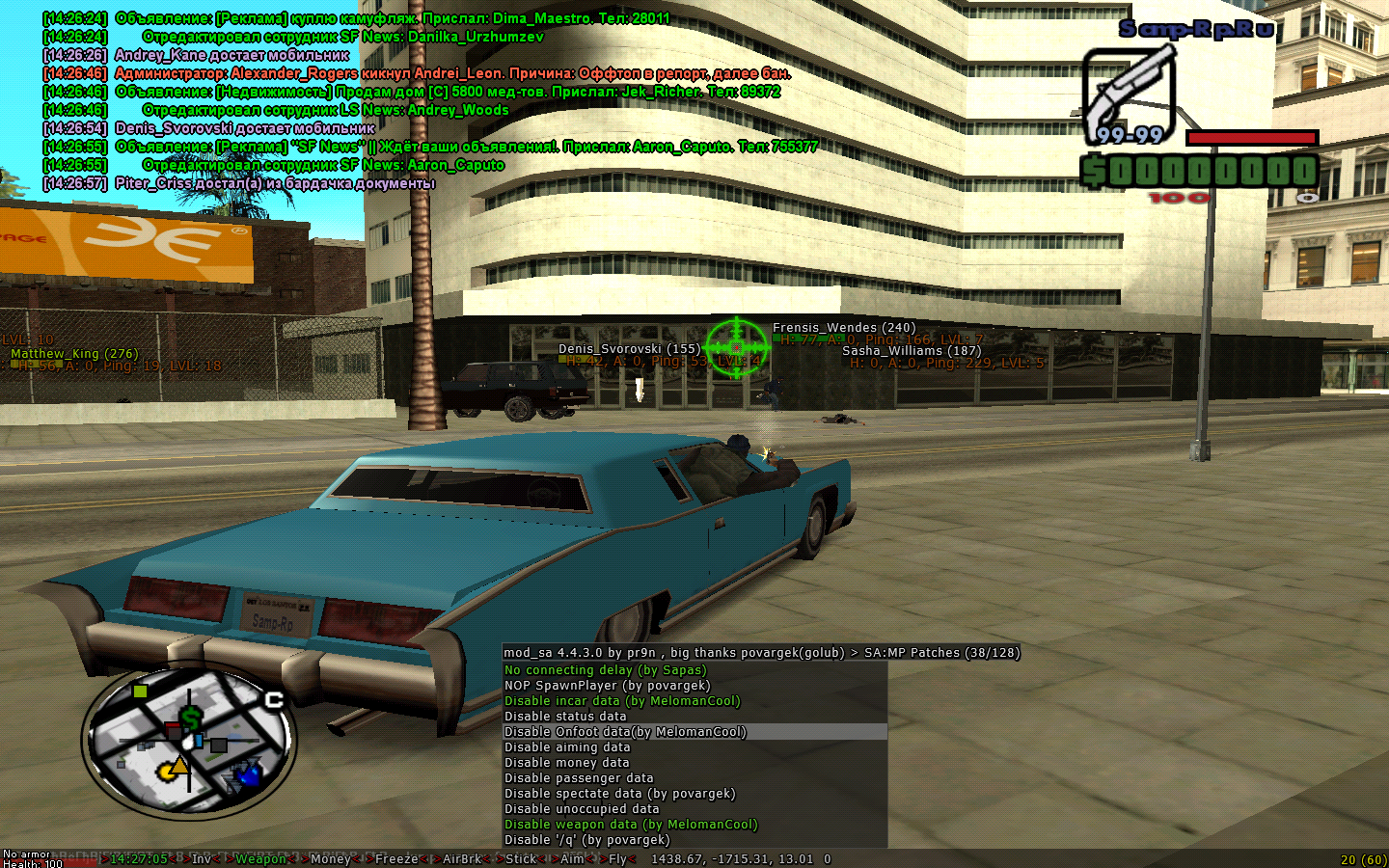 И так нам понадобиться каршот и собейт с такими нопами: "Disable Onfoot data(by MelomanCool)" &0 0 0x42D0 "" "C3" "Disable incar data (by MelomanCool)" &0 0 0x6060 "" "C3" "Disable weapon data (by MelomanCool)" &0 0 0x5660 "" "C3" "NOP RemovePlayerFromVehicle" &0 0 0x128F0 "" "C390"