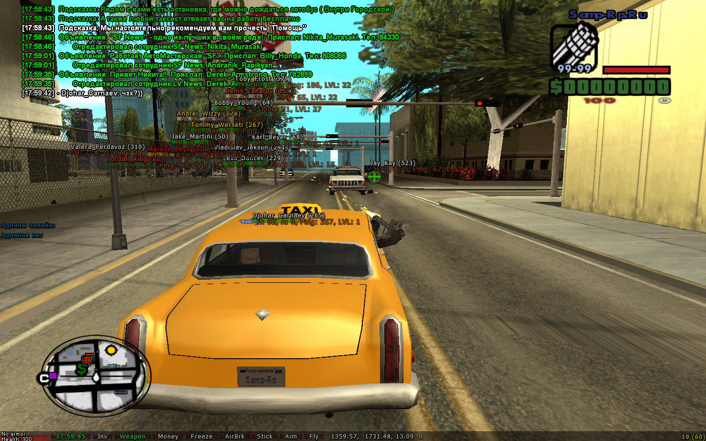 Подходим к незакрытому автомобилю, включаем нопы которые находятся выше. Затем идем во вкладку weapons, читерим миниган. Садимся в авто на пасс. место, достаем миниган, выключаем ноп Disable Onfoot data. Включаем каршот ctrl + h. Читерим. При убийстве 1-2 не кикает. Можно крушить автомобили
