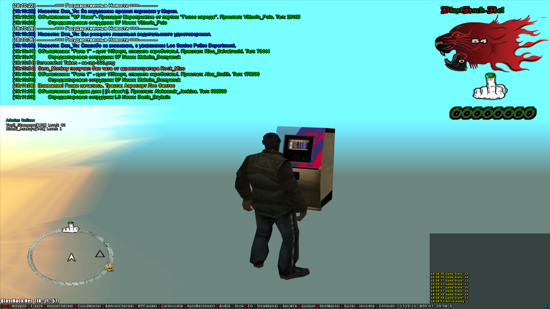 Здраствуйте. Нашел не большой баг, как успеть на слет. Появились и проходим сквозь пол AirBrk, далее вкл. гм и просто падаем. Когда упали, рядом с вами должен быть банкомат. ( Он рабочий кст. ) Далее, тп по карте: Profit. Дальше идем, тпешимся, летим, кукарекаем, едем. Про ХаусЧекер не забудьте. :D P.S Маленькое дополнение... Что бы успешно ловить дома с госа вкл. каринвиз и катаемся с HouseChecker по гетто. Когда в зоне прорисовки будет дом по госу, вас тп без кика ;3