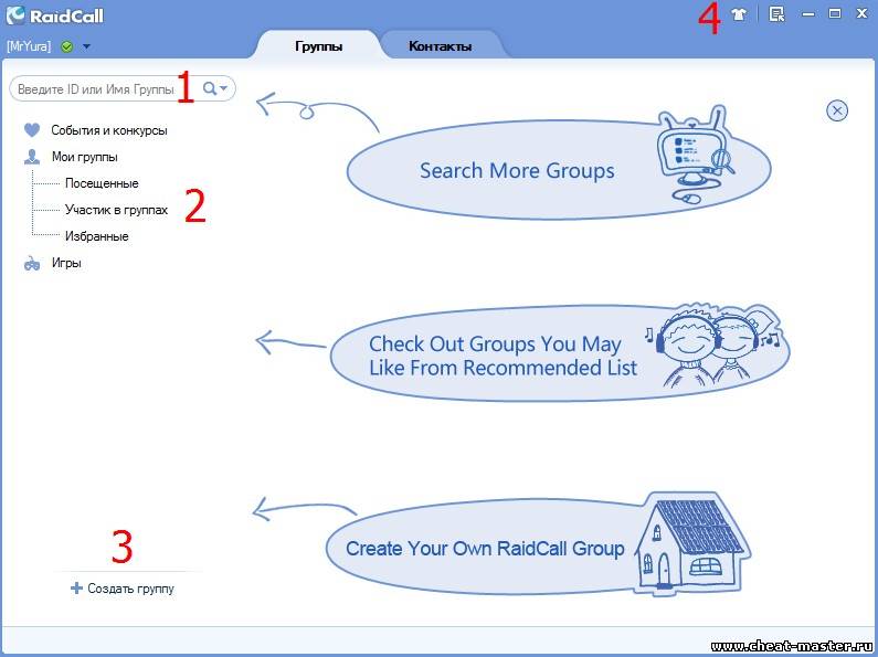 И так, мы зарегистрировались перед нами токое окно Что же мы на нём видим? Cейчас я вам подробно все распишу, это главное меню программы RaidCall. №1. Графа №1 предназначена для поиска групп, найти группу можно 2мя способами, по id и по Названию, id- уникальный номер группы, который есть только у неё, пример: Группа CheatMaster id -228 я могу найти эту группы ведя в поле либо CheatMaster либо 228