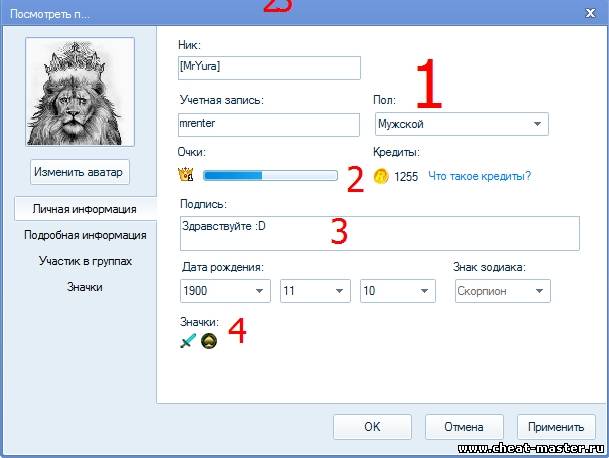 №1. Во круг цифры 1 мывидим поля,в которых показаны : Ник,Учетка,Пол. эта информация доступна всем пользователям