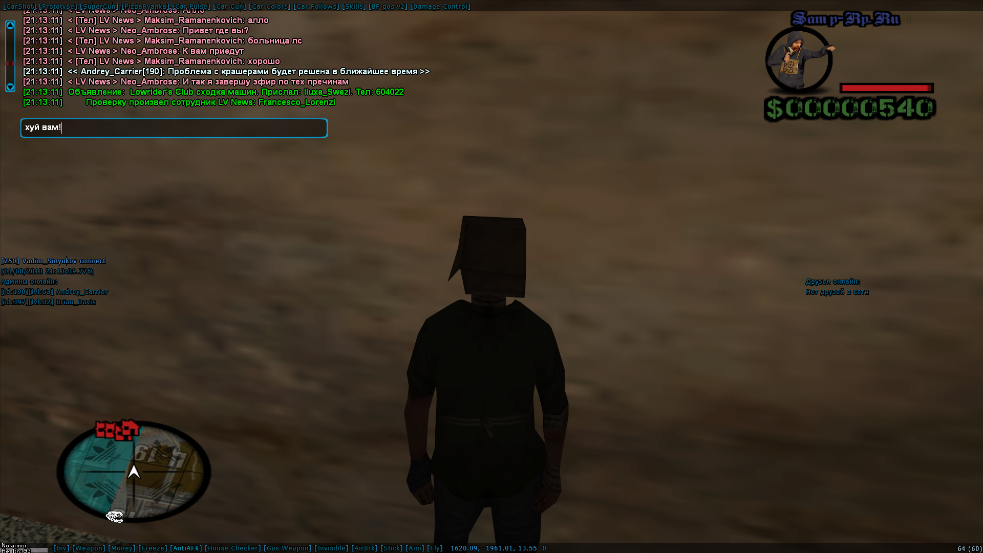 Глупый чит. Не люблю читеров, которые мешают другим игрокам, используя бред.. Например: Всё разносят у мэрии, стреляют из пулемётов или крэшат... Почему нельзя скачать что-то толковое и помогать игрокам?