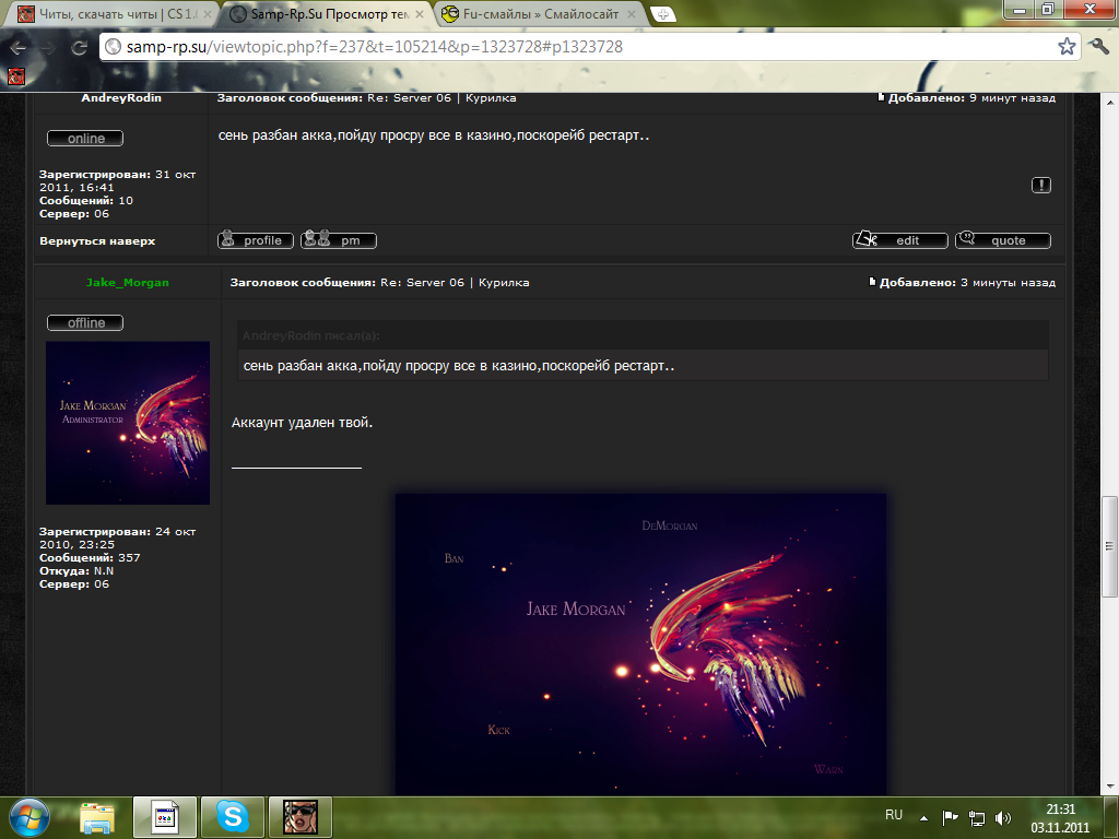 джейк п******* Добавлено (03.11.2011, 14:42) --------------------------------------------- Isaev, а нах мне акк? я соровно уже давно бросил самп,Ну ток читерю, Добавлено (03.11.2011, 14:59) --------------------------------------------- ахаха,унюхали еще одного твинка удалили Akeno_Yamomoto 4 vlv