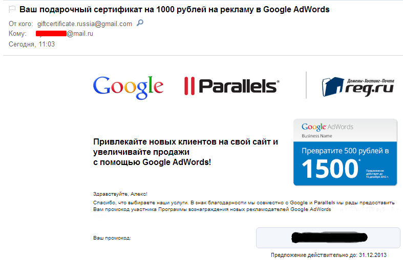| Подарочный сертификат на 1000 рублей на рекламу в Google AdW | ||||||