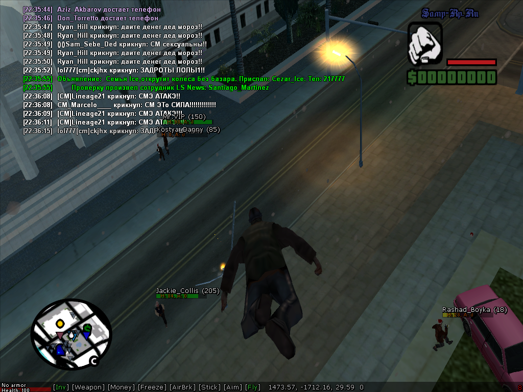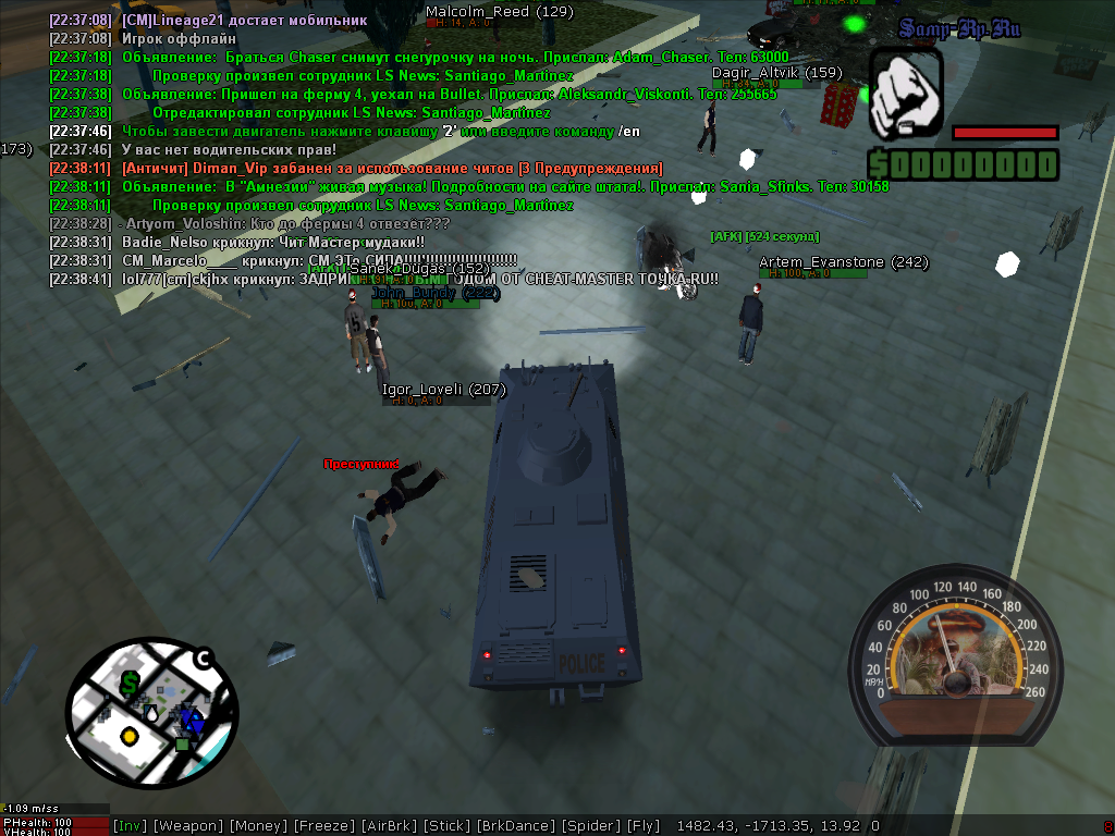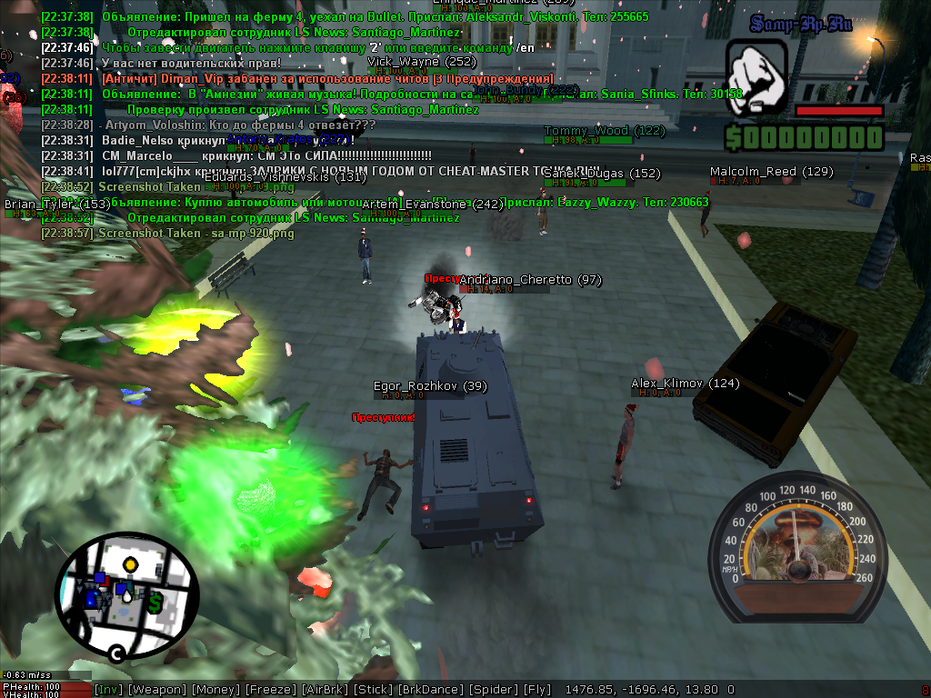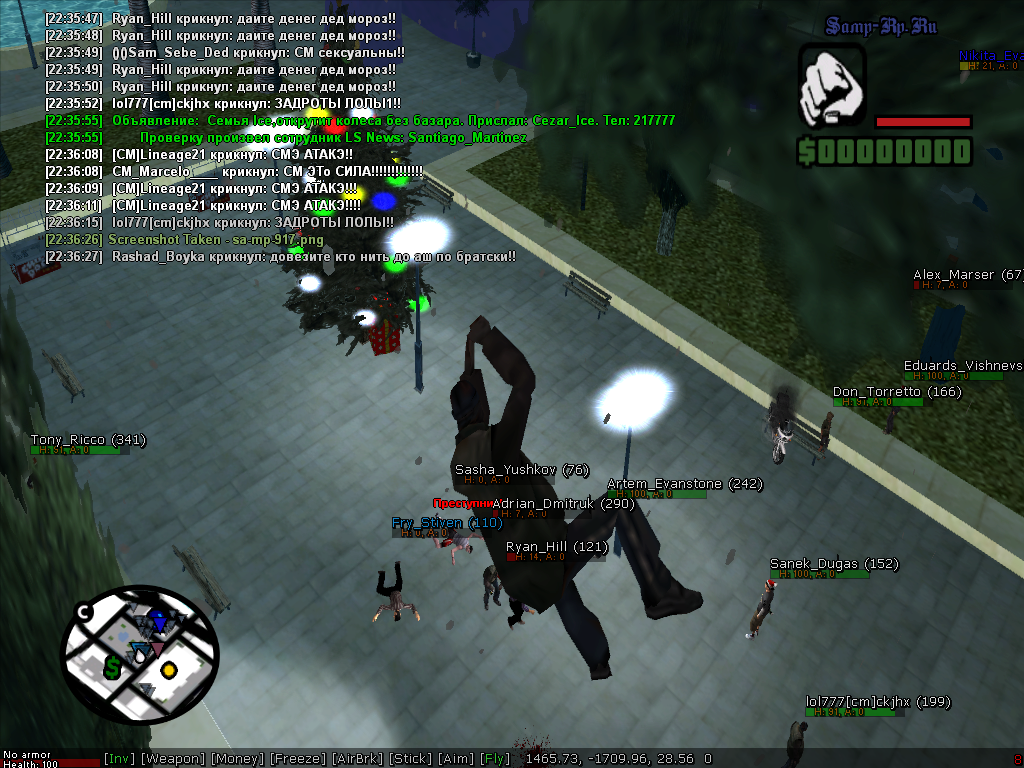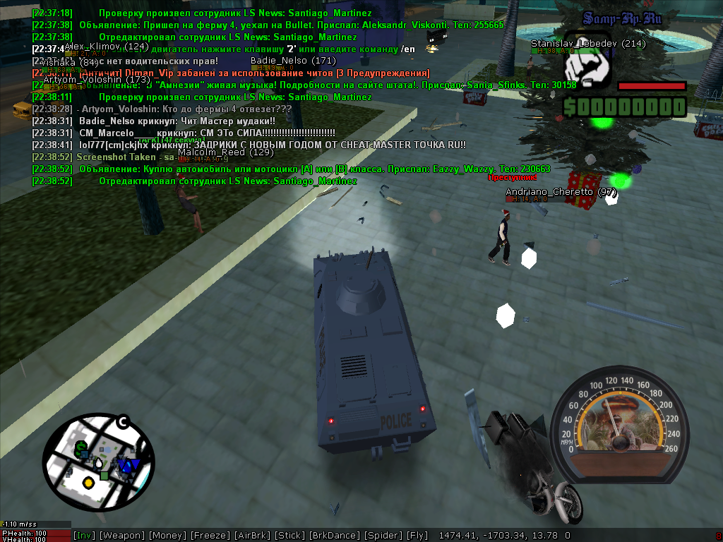И скрины с недавнего читерства, мэрия 08 сервера была отчищена за несколько секунд, Хотел бы сказать спасибо Самому_Себе_Деду, lol777[cm], CM_Marcelo__, который умело катался на инфернусе Вообщем, Samp-Rp 08, поздравлен с новым годом Скриншоты: