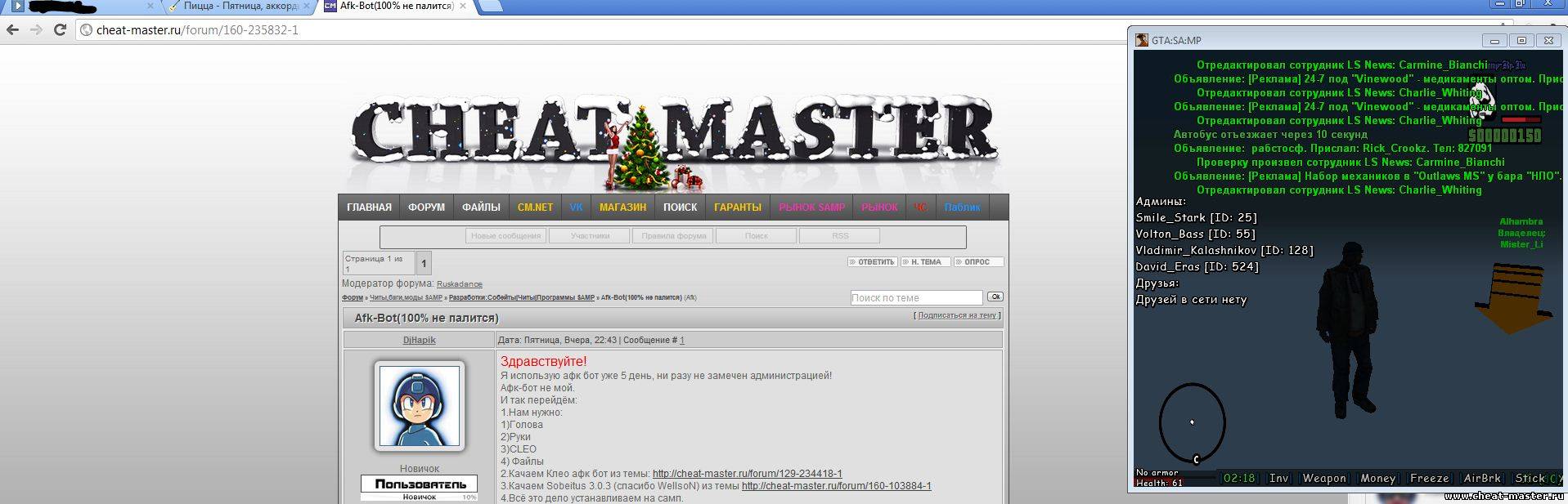 Здравствуйте! Я использую афк бот уже 5 день, ни разу не замечен администрацией! Афк-бот не мой. И так перейдём: 1.Нам нужно: 1)Голова 2)Руки 3)CLEO 4) Файлы 2.Качаем Клео афк бот из темы: http://cheat-master.ru/forum/129-234418-1 3.Качаем Sobeitus (спасибо WellsoN) из темы http://cheat-master.ru/forum/160-103884-1 4.Всё это дело устанавливаем на самп. 5.Заходим в игру 6.Нажимаем A+B (англ). 7.Нажимаем f11>>Samp rp>>AntiAFK. 8.Всё! Почему стоит использывать этот АФК БОТ P.S Использую CLEO с этого сайта http://www.gtavicecity.ru/gta-san....as.html ____________ По отдельности Клео скрипт Afk замечают админы,а вместе с Sobeitus не пропаливается. ____________ Тема 1,Я нуб Думаю кому то пригодится ! Кхм...Забыл... Кто не умеет устанавливать! 1