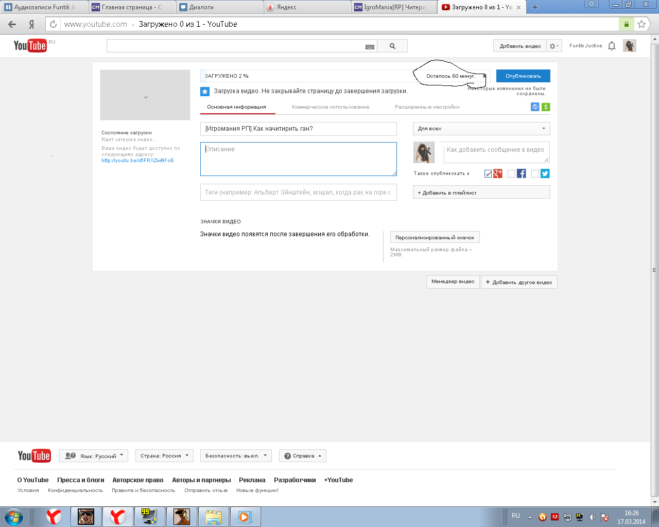 Цитата [CM]Konor (  ) Может.Сам загружал видео длиной 1.30 секунд у меня оно грузилось пол дня почти.Могу даже само видео кинуть.Сейчас посомтрим,что будет с моим видео YouTube с ума сошёл