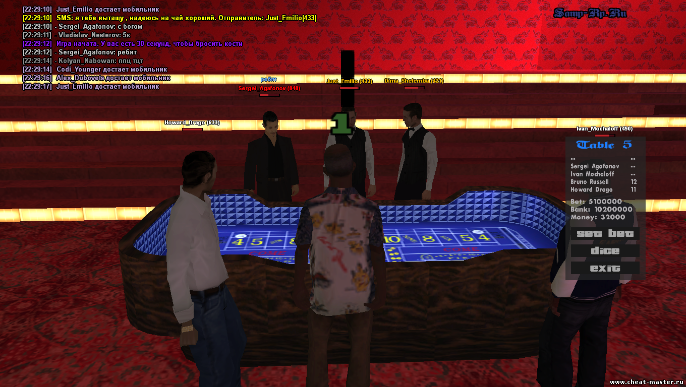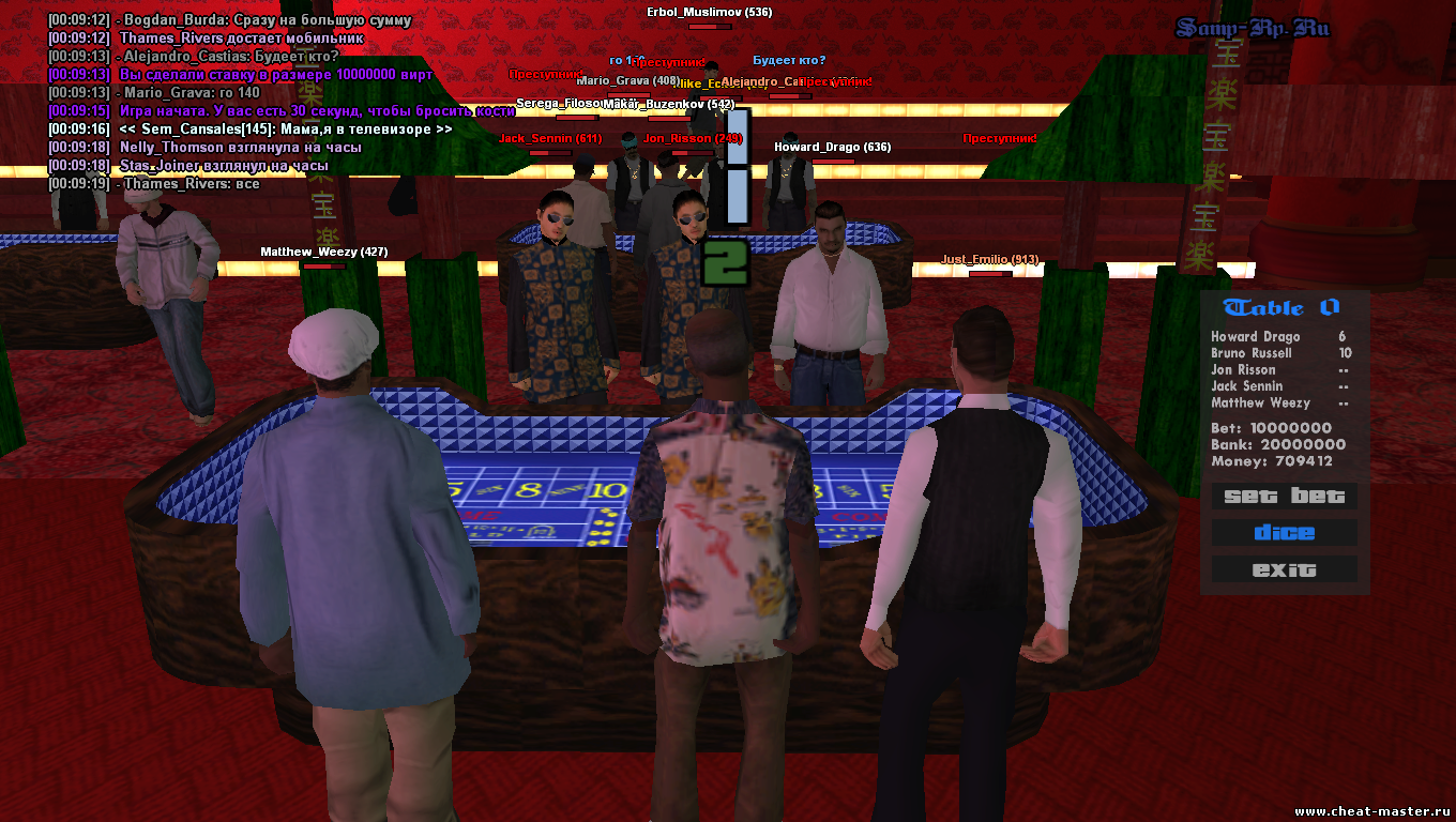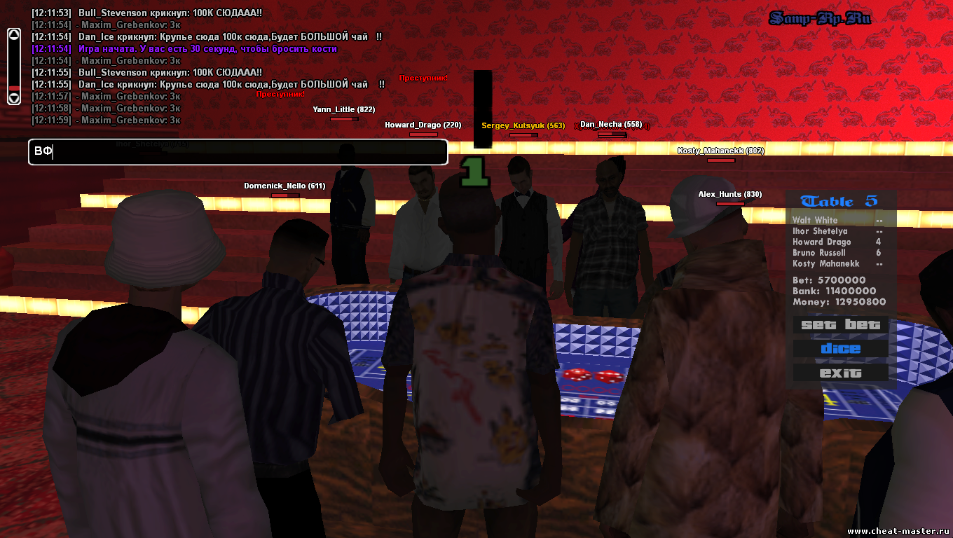 Здравствуйте дорогие мои друзья Сейчас я вам расскажу мою мини историю на 01 сервере Дело начиналось вот так.. Я Bruno_Russell известный также "Тащер казино" Я купил на cheat-mastere 1кк На скринах вы всё увидите Потом я пошёл в казино, играю на 1kk итог - выиграл И так на следующей день заработал 10kk Потом я играю на 10kk итог - выиграл Потом играл я на 14kk итог - выиграл И в этом я очень удивился, даже очень Я играл вам могу сказать с опасением проигрыша , но в итоге мне очень везло И таким образом я заработал 50kk. Игра по такой тактике : Ставлю ставку "Пишу в чат /time" и жду 1 секунду, и кидаю кости, очень часто выигрывал. Пробуйте так же сыграть , скорее всего будет "WIN". вот вам пару скринов с моих игр в казино на крупные суммы |