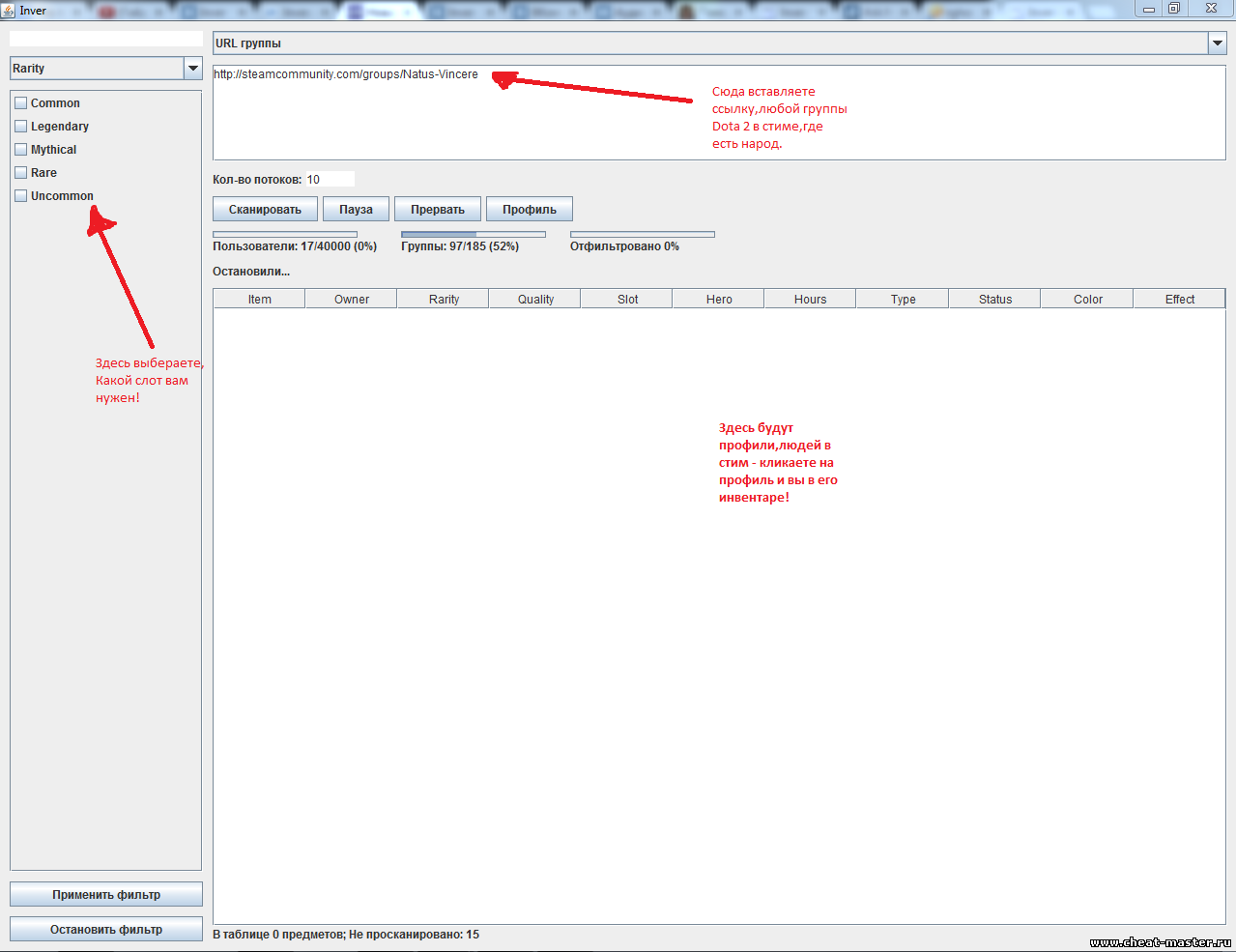 Как устанавливать? 1.Во-первых, надо обязательно что бы на вашем ПК была Java Скачать ее можно тут - http://www.java.com/ru/ без нее программа не запуститься! 2.Скачали,архив Winrar извлекаете в любую вами папку,после извлечения в той папке появится inver.java 3.Нажимаете на inver.java 4.Вы зашли в Inver Dota 2. Как пользоваться? Копируете ссылку любой группы стим,где есть народ. Группа должна быть о Dota 2,потому что Inver сканирует только вещи из игры Dota 2. В слотах можно выбрать,на какого героя:common,uncommonrare,mythical,legendary,arcane.