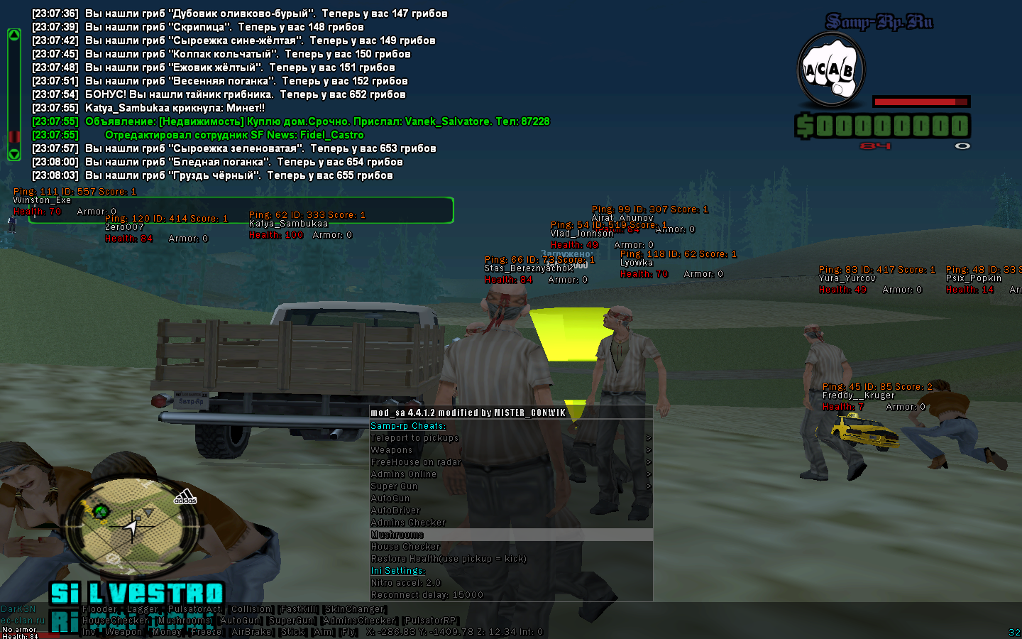 Начнем.. Бежим на ферму(любую) Переодеваемся. Бежим к авто. Не заходя на пикап, включаем в s0beit функцию Mushrooms [Samp-rp/Mushrooms] Ваш персонаж начинает собирать грибы. Админы и игроки думаю , что вы собираете урожай! Античит не кинет, так как вы приседаете. Как насобирали грибов, идем в любую закусочную не заходя в нее пишем /sellgrib (1 гриб по моему вирт 5 стоит)