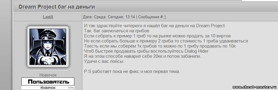 Что бы этот человек репу себе не набивал таким способом,я сразу заскринил что бы он не накручивал себе плюсы,кому надо тот посмотрит.Тем не менее администраторы уже спалили кантору,и не зависит скину этот пост я или нет,а как спалят если интересно напишу в лс. Цитата И так здраствуйте читерюги я нашёл баг на деньги на Dream Project Так. баг заключаться на грибов Если собрать к пример 1 гриб то на рынке можно продать за 10 виртов Но если собрать больше к примеру 2 гриба то стоимость 1 гриба удваиваеться Тоесть если мы соберём 1к грибов то можно по 1 грибу продавать по 10к Чтоб быстрее продавать грибы воспользуйтесь Dialog Hider Я на этом способе наварил себе 20кк и потом забанили. Зачем создавать тему,про что то,а потом взять и убрать это и за плюсы давать способ?Навариться решил?Не так не честно.
