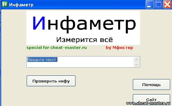 Программа развлекательная, конечно это всё в шутку :) Суть: Вы вводите текст, жмёте "Проверить инфу", и вам выдает кол-во %. Не относитесь к этому серьёзно Скачать: http://rghost.ru/57018560 VT: 1/52 Скриншот: