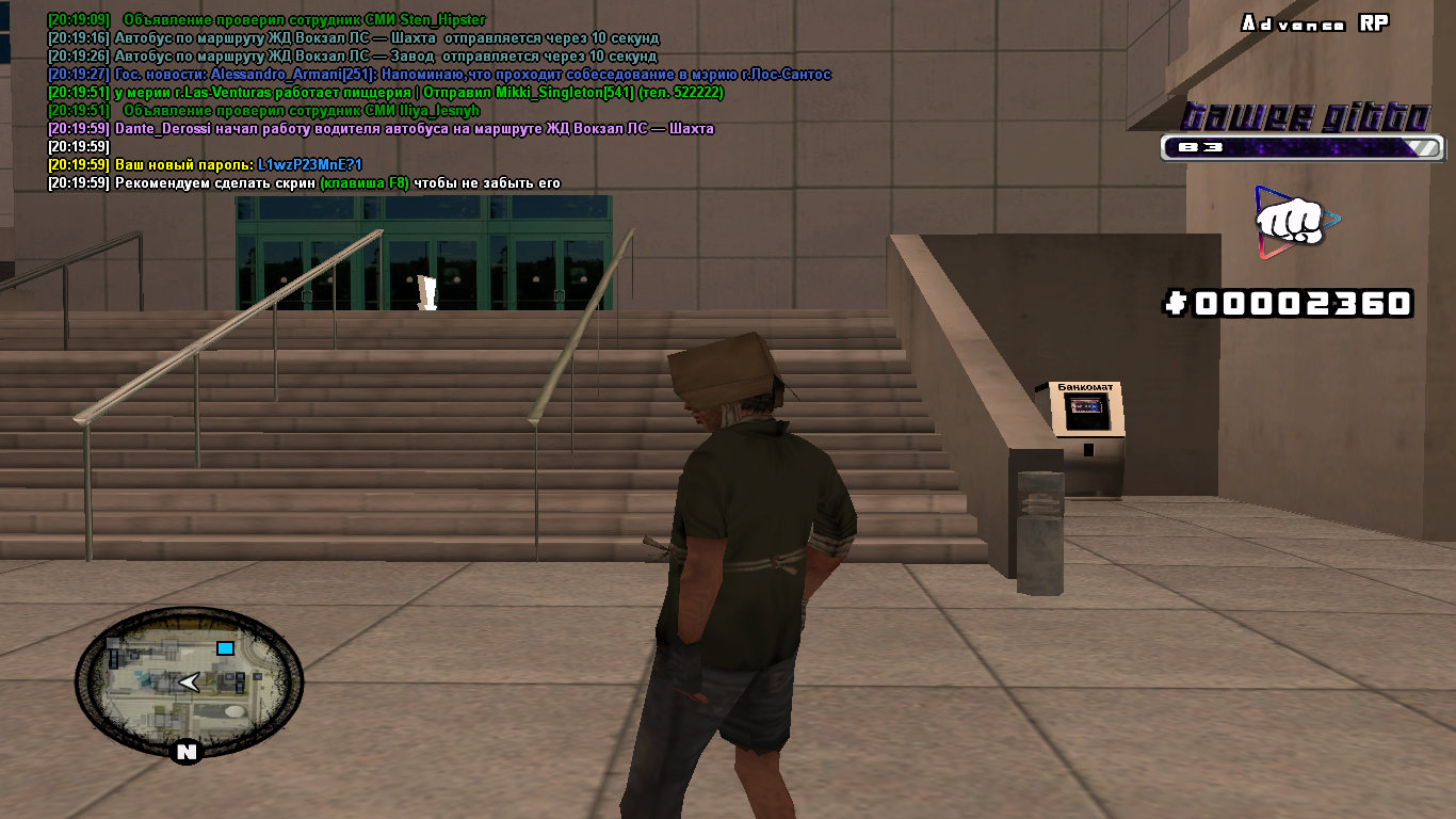 Цитата [CM]Ta4er (  ) Ник: Leo_Ainulov Password: cheatmaster Пустышка. ARP - Red P.S Скоро будут жирные акки ожидайте :) Вот, если кому интересно что за акк. Код Имя: Leo_Ainulov Номер аккаунта: 311760 Наличные деньги: 89$ На основном банковском счету: 0$ Пол: мужской Проживание: бездомный Бизнес: нет Заправочная станция: нет Уровень: 3 Очки опыта: 8 из 16 Организация: нет Работа / должность: Таксист Номер телефона: 1311760 На счету телефона: 914$ Законопослушность: 21 Уровень розыска: 0 Уровень улучшений: 0 Наркотики: 10 гр Патроны: 0 шт. Металл: 0 кг Водительские права: базовый уровень Лицензия на оружие: отсутствует Сумма всех пожертвований: 0$ Общая сумма всех пополнений счёта: 0.00 руб.