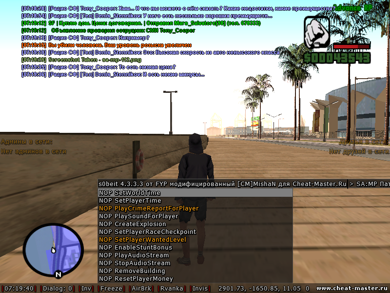 У меня вообщем есть акк в ПД на адвансе,и я когда хотел отрубить худ собейта мишана наткнулся на нопы,и решил с ними похимичить,зашел и с ПД и твинка одновременно,на бомжатнике нашел какого то бомжа,дал ему 5к и попросил помочь,с твинка я убил бомжа,тем самым получив звезду.Дальше дело было за ПДшником.На твинке я включил очень хороший ноп-NOP Send Death(SendPlayerDeath).После я чисто расстрелял твинк из МП5.Свершилось.Я даже подумал что это как то странно.В чат ЛСПД не сообщило о нестрализации преступника,я как ни в чем не бывало альттабнулся на твинк,и увидел что он зареспался так же с одной звездой,на обыкновенном бомжатнике,с такими же хп,которые были перед смертью.Вот такие пироги. Короче 1. Включаем NOP Send Death(SendPlayerDeath) 2. Идем тралить неадекватных ментов которые хотят чисто бабла с вас набрать к ЗП А пока что,пока вдохновение нахлынуло,попробую сделать чтоб игроку звезды не давались. Вдохновение не прошло зря,через 15 минут после темы нашел способ на нопах чтоб звезды не давало Включаем данные нопы,которые указаны на скрине !После реконнекта отдает звезды! Скорее всего со звездами визуал