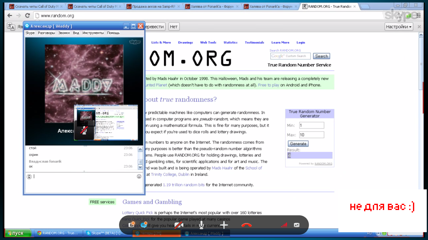 Пишем числа по порядку, начиная с 1 до 10. Победителя определяю по random.org. Приз: 11 лвл 04 серв 2 варна 1:Merine 2:side75 3:Samp-Gang 4:Барыга 5:iMaddy 6:Тузик 7:Eric_Morallez 8: danya777_kirov 9:Черный Эльдар 10:[CM]Hovik