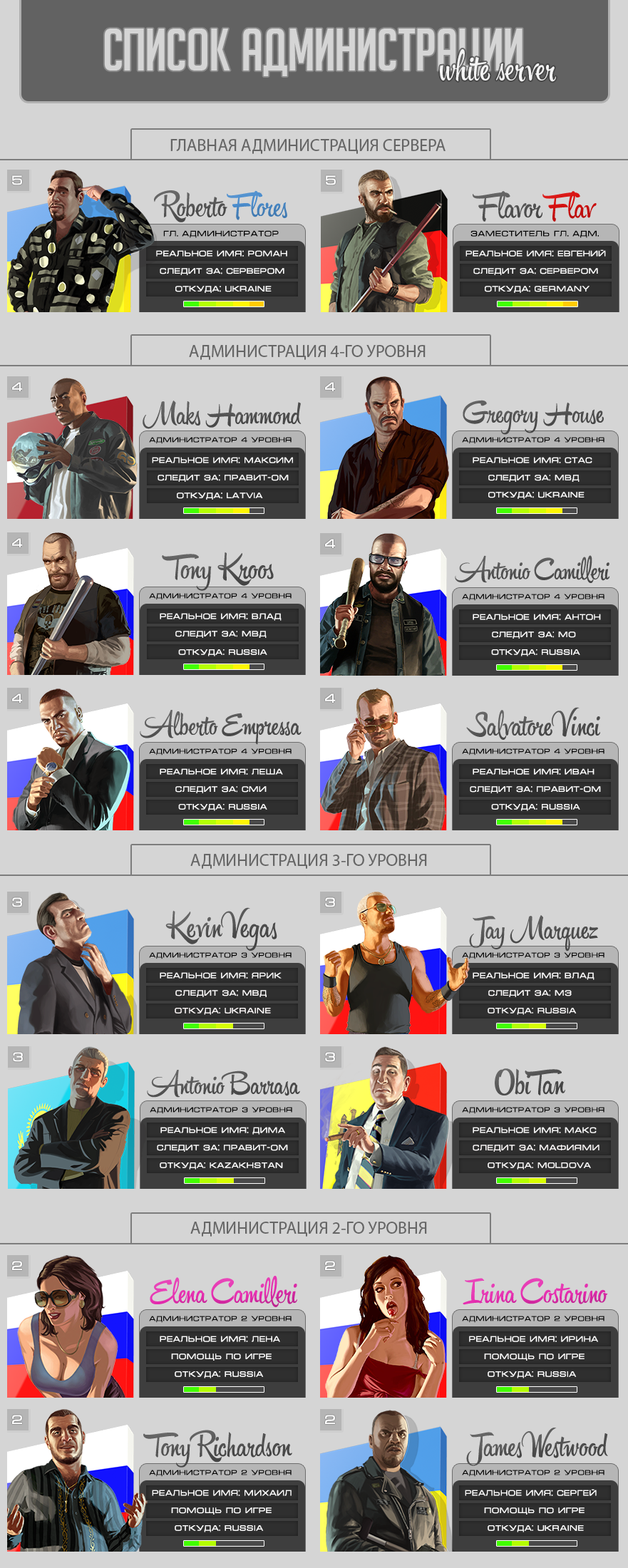 White Server | Список Администрации [NEW 18.08.2014] Roberto Flores Flavor Flar Tony Kroos Antonio Camilleri Alberto Empressa Salvatore Vince Kevin Vegas Jay Marquez Antonio Barrasa Obi Tan Elena Camilleri Irina Costarino Tony Richardson James Westwood
