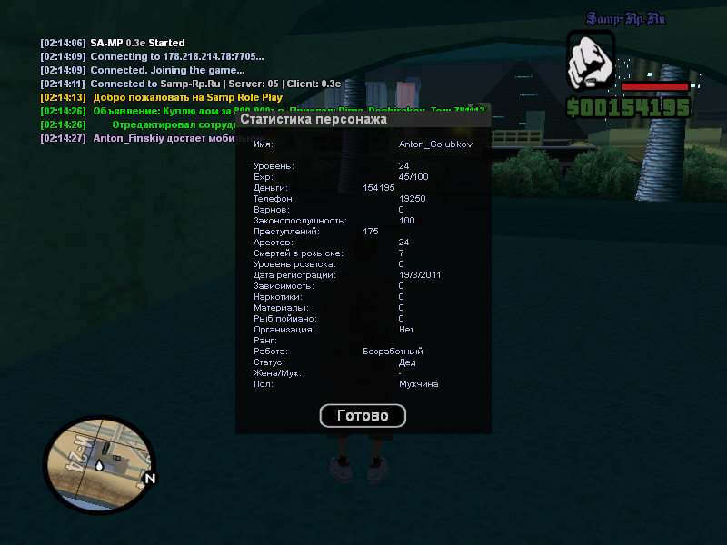продам акк на самп-рп 05 24лвл 650к наличности +скин за 300к