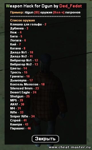 Использование: /whack - Активация/Дезактивация weapon hack режима Код /dgun - [ID] оружия [Кол-ч] патронов /dinfo - Список оружия (Узнать ID)