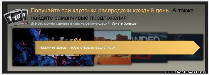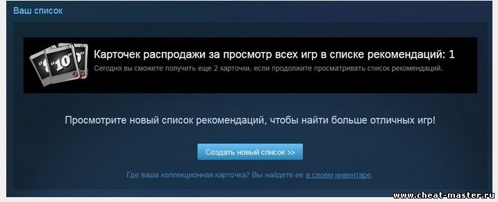 Как получить карточки с Зимней распродажи в Steam 2015-2016 1. Переходим в магазин Steam - http://store.steampowered.com/ 2. Листаем вниз и видим "Список рекомендаций"