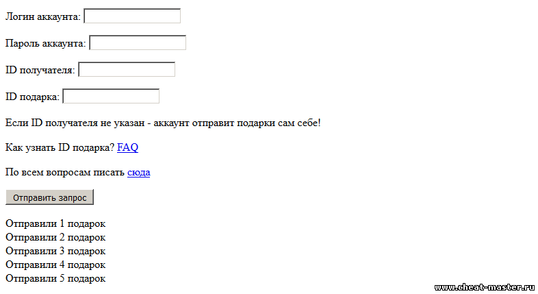 Добавлено (16.01.2016, 10:40) --------------------------------------------- Добавлена возможность отправки анонимно. Добавлена возможность прикрепления сообщения. Когда появятся бесплатные подарки у кого, проверьте. Возможен баг с анонимной отправкой.