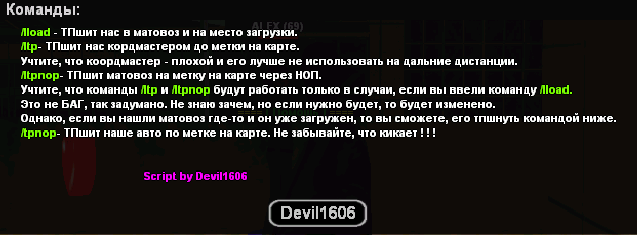 2.Когда мы загрузимся, мы выбираем, что нам делать с матовозом: 1) Если мы возим самостоятельно с твинка в форме, то открываем карту, ставим метку и вводим /ltp . Нас кордмастером ТПшнет по метке.(Учите, что кордмастер не лучший и его лучше использовать только для того, чтобы вывезти матовоз с зоны) 2) Если мы имеем твинка в армии и у нас есть напарник с банды в форме, то мы можем ТПшить ему матовоз, то открываем карту, ставим метку и вводим /ltpnop Наш матовоз ТПшнет на метку, а нас кикнет, но ваш товарищ получит матовоз и сможет его разгрузить.Так же в скрипте, есть мини-справка, которая поможет вам лучше ориентироваться при работе со скриптом(на случай, если вы что-то забудете): /lhelp