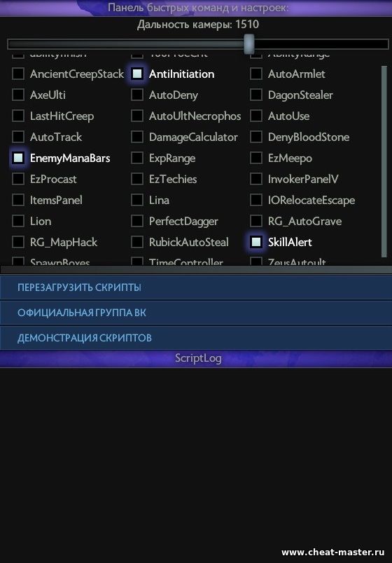Описание всех скриптов: AncientCreepStack - приручаете крипа доминатором , он автоматически стакает эншентов. Antilnitiation - при врыве энигмы в 5 когда она собирается кастануть бх автоматически дается хекс , еул, орчид. AutoArmet - Автоматически абузит армлет. AxeUlti - Автоматический ульт акса учитывает армор и бафы. AutoDeny - Автоматически денаит крипов, когда это возможно. DagonStealer - Добивает дагоном врага если он находится в радиусе убийства дагоном, учитывает армор и все бафы. LastHitCreep - Автоматически добивает крипов. AutoUltNecrophos - Автоматическая ульта некра. AutoUse - Автоматически прожимает стики, меку когда у вас 100 хп, ботл(на фонтане), фазы. AutoTrack - Автоматически раздает треки на всех героев за бх. DamageCalculator - Показывает сколько дамага внесли герои на карте, полезно когда калибруешь аккаунт, видишь сколько ты внес дамага. DenyBloodStone - Автоматический суицид когда остается 5% здоровья. EnemyManaBars - Показывает вражескую ману, на иллюзиях нет маны, полезно против наги. ExpRange - Показывает на каком расстояние можно получать XP. EzMeepo - Автоматические пуфы и сетка. EzProcast - Можно сделать любой прокаст из ваших скиллов и предметов 1 кнопкой. EzTechies - Автоматически взрывает зеленые мины имеено столько сколько нужно чтобы убить врага, автоматический форс стаф на мины. InvokerpanelV - Показывает все скиллы инвокера и кд на них. ItemsPanel - Показывает вражеские предметы, оповещение при покупке вардов, дагера, дастов. Lina - Автоульта на лину. IoRelocateEscape - Когда ио ультует , появляется на фонтане и чтобы не возвращаться в замес, скрипт юзает тп по таймингу и получается так что вы появляетесь на месте телепортации на секунду и появляетесь там куда юзнули тп, покажу в скайпе. Lion - Автоульт на лиона. PerfectDager - Дагер без уменьшения расстояния. RG_AutoGrave - Автоматический крест на дазле. RG_MapHack - Мапхак. RubickAutoSteal - Автоматически ворует ульты героев. SkillAlert - Показывает санстрайки, набег бары, шар туска, торент кунки, через всю карту. SpawnBoxes - Показывает рейндж нейтралов. TimeController - Показывает что через 15 сек руна и через 5 сек нужно будет юзнуть мидас. ZeusAutoult - Автоматическая ульта на зевса.