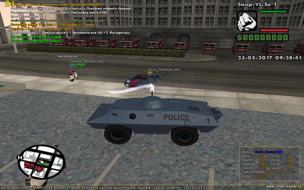 Нам понадобятся следующие нопы NOP SetPlayerPos- Чтобы вас не тпшило из транспорта NOP RemovePlayerFromVehicle - Чтобы вас не выкидывало из транспорта NOP SetEngineState - (Можно заменить на клео "Езда без бензина" или собейтом с этой же функцией) Не палиться администрацией. Если только в репорт не напишут