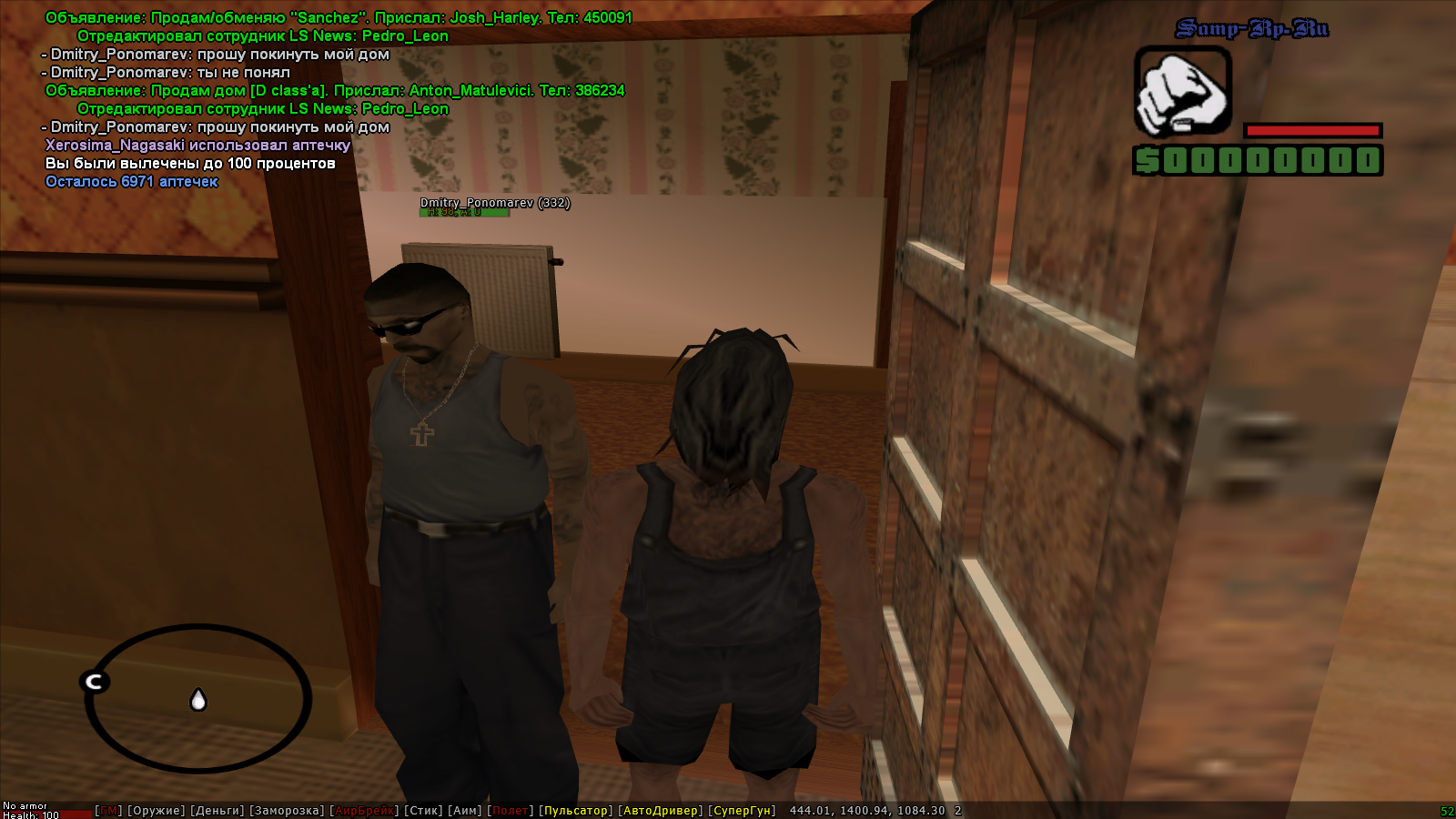 Чтобы не тратить деньги в пустую рассказываю способ: 1. Ищем открытый дом, не обязательно чтобы человек кому принадлежит дом был онлайн (их там достаточно ) 2. Заходим в него и проверяем есть ли в нем аптечки командой ( /healme ) Кому помог буду рад +