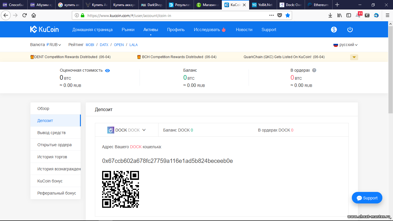 garadavoy, 1) Регистрируемся тут: https://www.kucoin.com/ 2) Заходим в "Активы", слева в меню выбираем "Депозит" 3) Выбираем кошелек DOCK, и видим что нам присваивается номер кошелька. 4) На сайте https://app.dock.io/ мы выводим именно на этот кошелек. 5) Дальше пока идет вывод, мы Регистрируемся тут: https://yobit.net/ 6) Переходим на вкладку "Балансы" 7) Выбираем BTC и жмем на плюсик (+) "Ввод" 8) Нам дается номер биткоин кошелька. 9) Возвращаемся на сайт https://www.kucoin.com/ и дожидаемся пока средства обработаются и поступят на баланс. 10) После поступления средств, переходим в раздел "Вывод средств" и выбираем нашу валюту DOCK 11) Вводим наш кошелек BTC который мы получили на сайте https://yobit.net/ и заполняем оставшуюся информацию. Предупреждаю что Минимальная сумма вывода :100 (20 DOCK - СНИМЕТСЯ КОМИССИЯ!(Вычитается из баланса)) По этому желательно нафармить больше 120!!! 12) Выводим на BTC кошелек, и переходим на сайт https://yobit.net/ и переходим в графу "Трейд" 13) Делаем обмен на USD или RUB. 14) Дальше переходим в графу "Балансы" 15) Выбираем USD или RUB, и выводим на фрукт фрукт киви, яндекс, или карту.