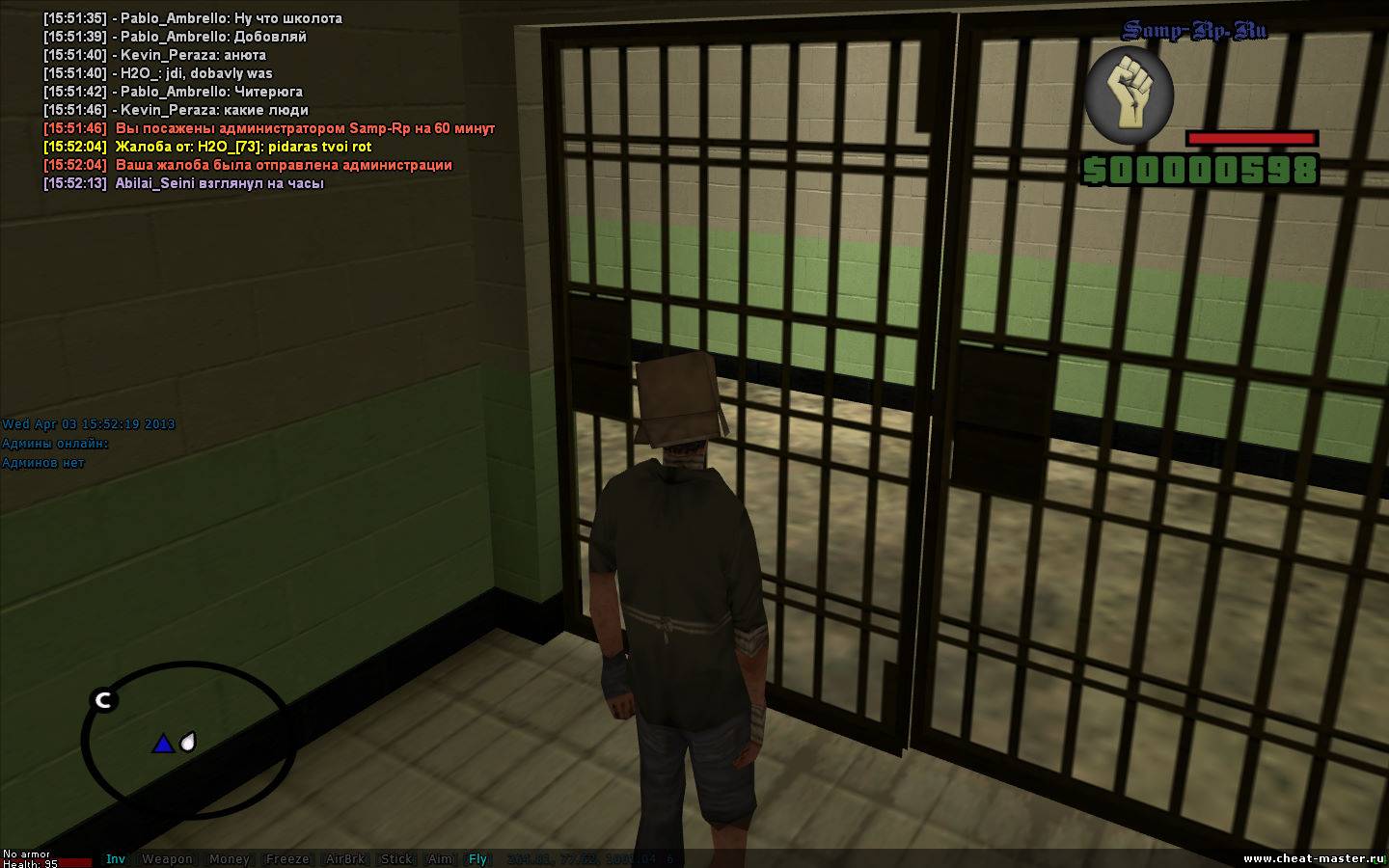 Доброго времени суток, дорогие пользователи сайта Cheat Master. Сегодня, я как обычно зашёл на сервер задротов чтобы весело провести ближайшие минут 30. И что же я вижу ? Заметил пока-что 2 нововведения: 1)Теперь, для игроков 1-3 lvl'a отправлять SMS-сообщения можно 1 раз в 30 секунд. Это очень плохо для людей, раскручивающих свои собственные сервера, в общем для пиара это очень плохо. 2)Когда я включил "pizdarvanky" в собейте от Wa3ix'а, я убил пару человек и когда убил 4-го или 5-го я автоматически появился в тюрьме с надписью в чате: "Вы посажены администратором Samp-RP на 60 минут" (В прикрепленном изображении видно, что Администраторов не было, также я написал нецензурную брань в репорт - не было наказания. Администраторов не было.)