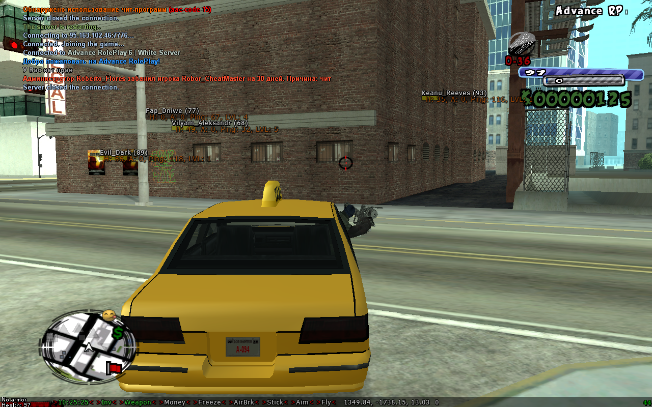 И так что мы делаем? Читерим миниган, нас кикает. Реконектимся и не доставая минигана бежим к тачке и включаем нопы: Disable onfoot data, Disable weapon data, NOP SetPlayerAnimation. Дальше мы садимся в тачку пасажиром и включаем каршот(ctrl+H). Нопы мы не выключаем так и ездим. НО: людей убивать у нас не получиться, если убиваем человека нас кикает за ДБ. В тачки можем стрелять спокойно. Ну вот и всё. Читерим, радуемся.
